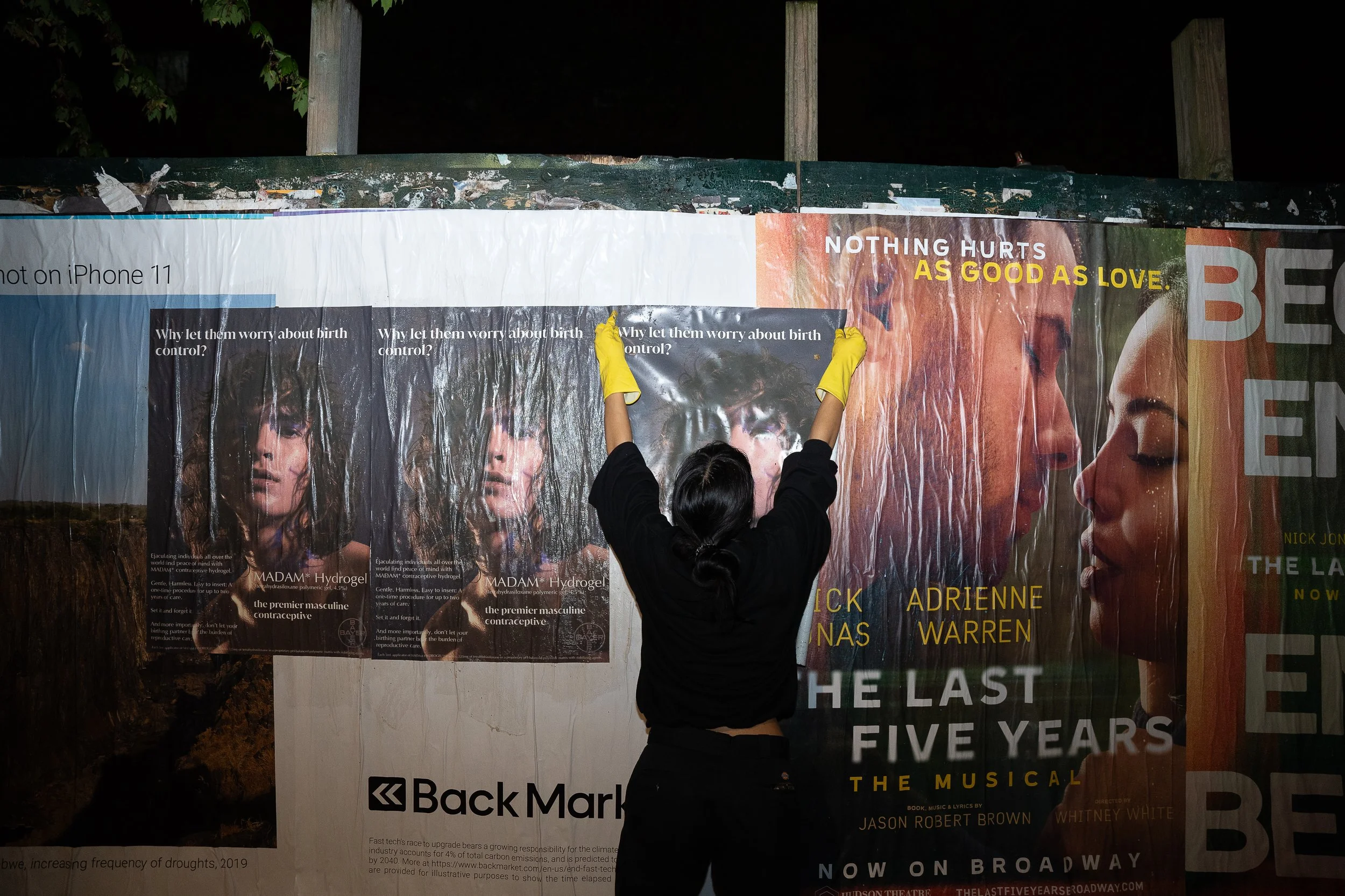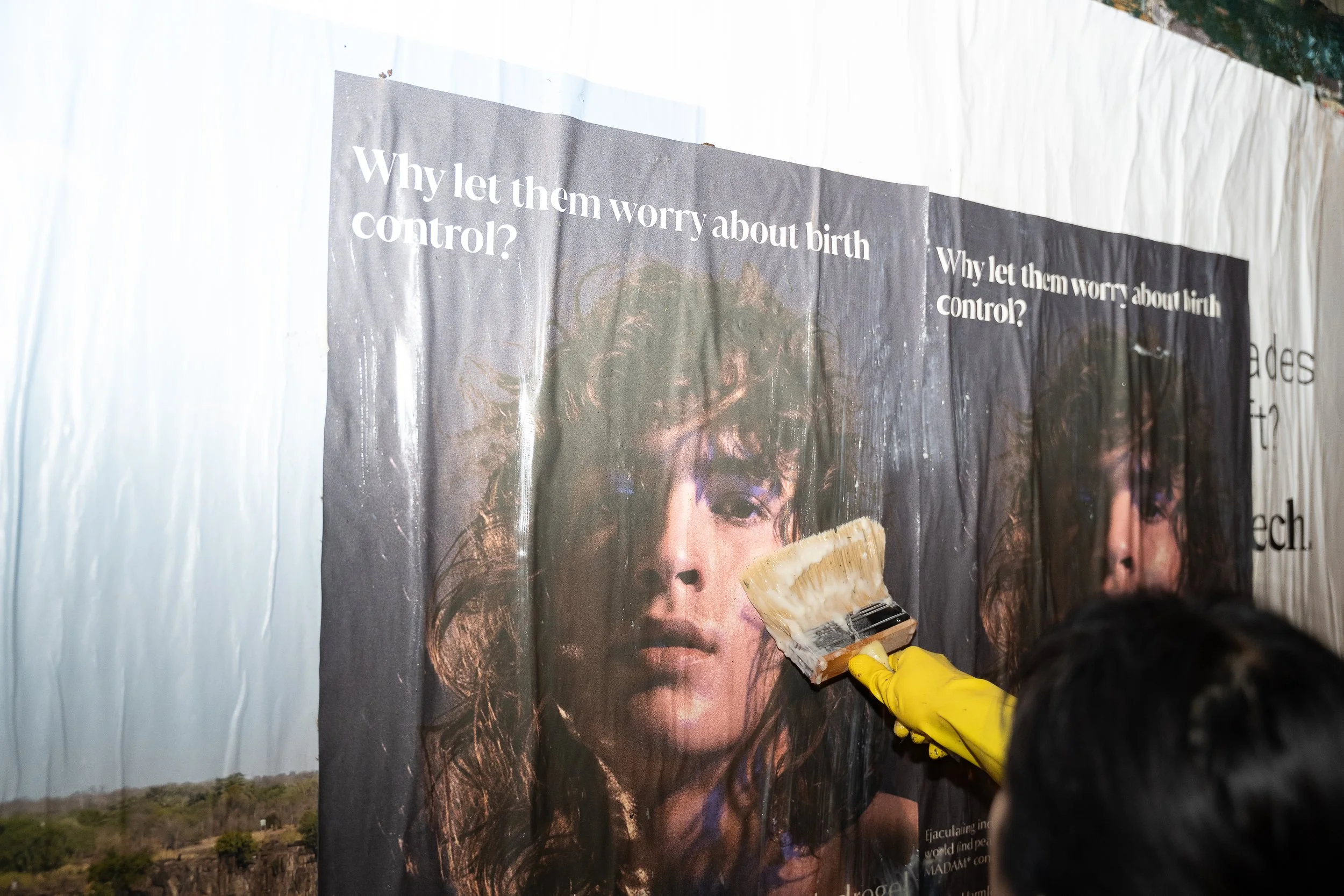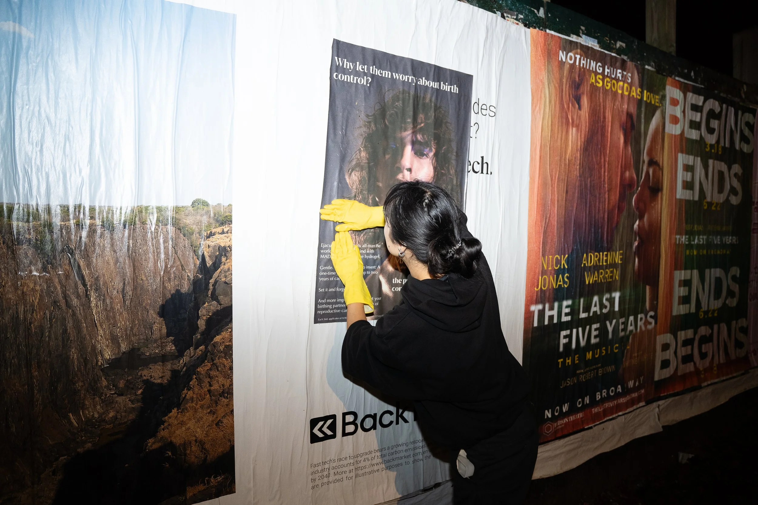 The photographs themselves carry an eerie, documentarian gaze: illuminated by harsh flash, the installations appear as though captured at the scene of a crime. The thick, glue-like wheatpaste further echoes the act of reproduction—viscous, messy, and inescapably bodily—transforming a street intervention into a meditation on biology, power, and accountability.